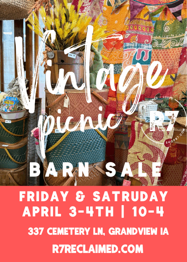 Come find your picnic pieces at R7 Reclaimed’s Spring Barn Opening—April 3rd & 4th, 10am–4pm, 337 Cemetery Lane, Grandview, Iowa. We’ll have the baskets, the blankets, the games, and all the color your spring afternoon deserves.
