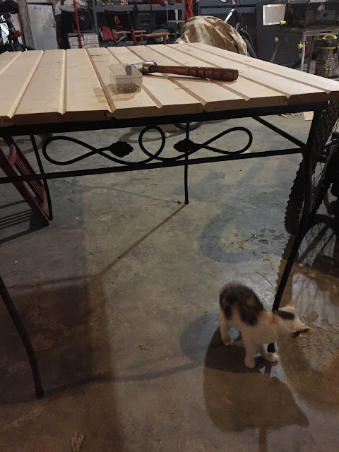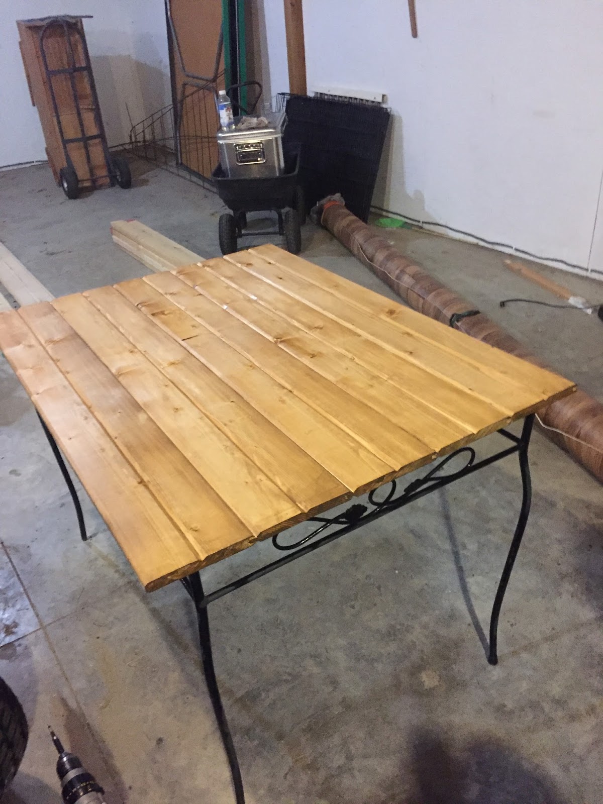 I forgot to take a “before” pic as usual but it was all metal with no seats or table top. We had some scraps of “car siding” similar to what we used on our family room ceiling.